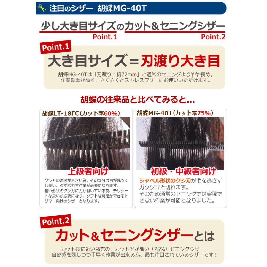 | 商品の特徴 | トリミングシザー 胡蝶 MG-40T(スキ/6.5インチ/カット率75。東京理器 胡蝶 MG-40T(お手入れセット 1回研ぎ無料券付。トリミングシザー 胡蝶 CVH-40T(カーブセニングシザー/スキバサミ。胡蝶のセニングです6.5インチカット&セニングシザーのフラッグシップ\"\"カット率75%のブレンディングシザー\"「スコップ状」のクシ刃で毛をしっかりキャッチ!!切り上がりがきれいで、残り毛が出ないため、ボカシながら仕上げることが従来品よりやや長いサイズで従来届きにくかった部分もカット出来、作業効率もUPします。楽天市場】胡蝶 セニング mg-40tの通販。3年ほど前に購入出番が少ないため出品しますザクザク切りたい方におすすめです細かいキズや、毛が残っている可能性がありますが、ご了承ください | ||