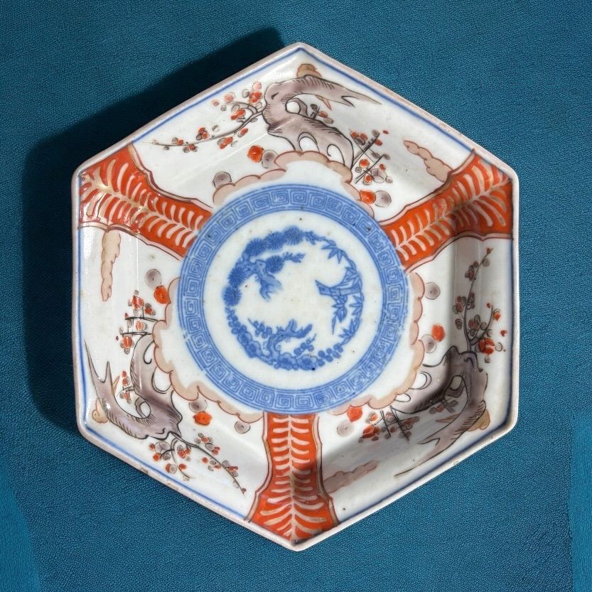 - 美術品・アンティーク・コレクション > 工芸品 > 小皿■古い伊万里赤絵 鶴 松竹梅 窓花唐草紋 6枚 骨董品(江戸後期~明治期)■ 古伊万里 金彩 色絵 [窓絵松竹梅図] 六角皿 小皿 角皿 取り皿 飾り皿